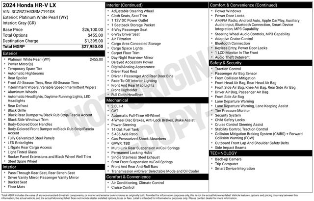 2024 Honda HR-V LX Platinum White Pearl AWD CVT 2.0L I4 DOHC 16V i-VTEC 25/30 City/Highway MPG