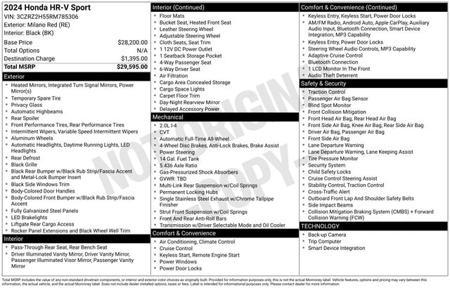 2024 Honda HR-V Sport Milano Red AWD CVT 2.0L I4 DOHC 16V i-VTEC 25/30 City/Highway MPG