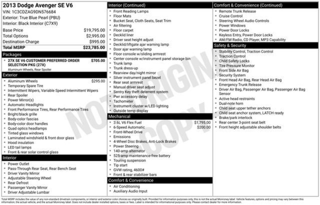 2013 Dodge Avenger SE True Blue Pearlcoat FWD 6-Speed Automatic 3.6L V6 24V VVT 19/29 City/Highway MPG