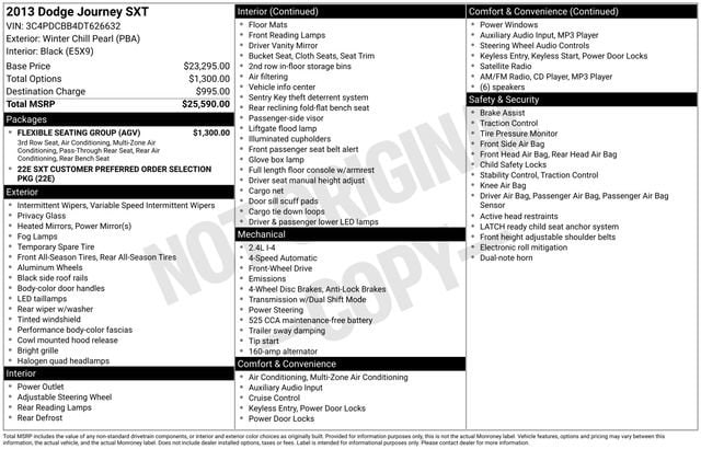 2013 Dodge Journey SXT Winter Chill Pearlcoat FWD 4-Speed Automatic VLP 2.4L I4 DOHC 16V Dual VVT 19/26 City/Highway MPG