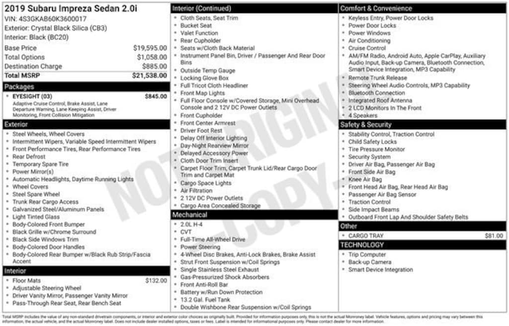 Recent Arrival! Odometer is 15038 miles below market average!2019 Subaru Impreza 2.0i Crystal Black Silica AWD CVT Lineartronic 2.0L DOHC 28/38 City/Highway MPGAwards:* ALG Residual Value Awards, Residual Value Awards * 2019 KBB.com 10 Coolest New Cars Under $20,000 * 2019 KBB.com 10 Best All-Wheel-Drive Vehicles Under $30,000 * 2019 KBB.com 5-Year Cost to Own Awards * 2019 KBB.com Brand Image Awards
