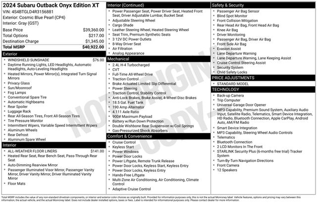 2024 Subaru Outback Onyx Edition XT Cosmic Blue Pearl AWD CVT Lineartronic 2.4L DOHC 22/29 City/Highway MPG