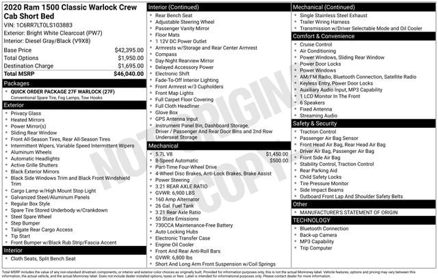 2020 Ram 1500 Classic Warlock Bright White Clearcoat 4WD 8-Speed Automatic HEMI 5.7L V8 Multi Displacement VVT